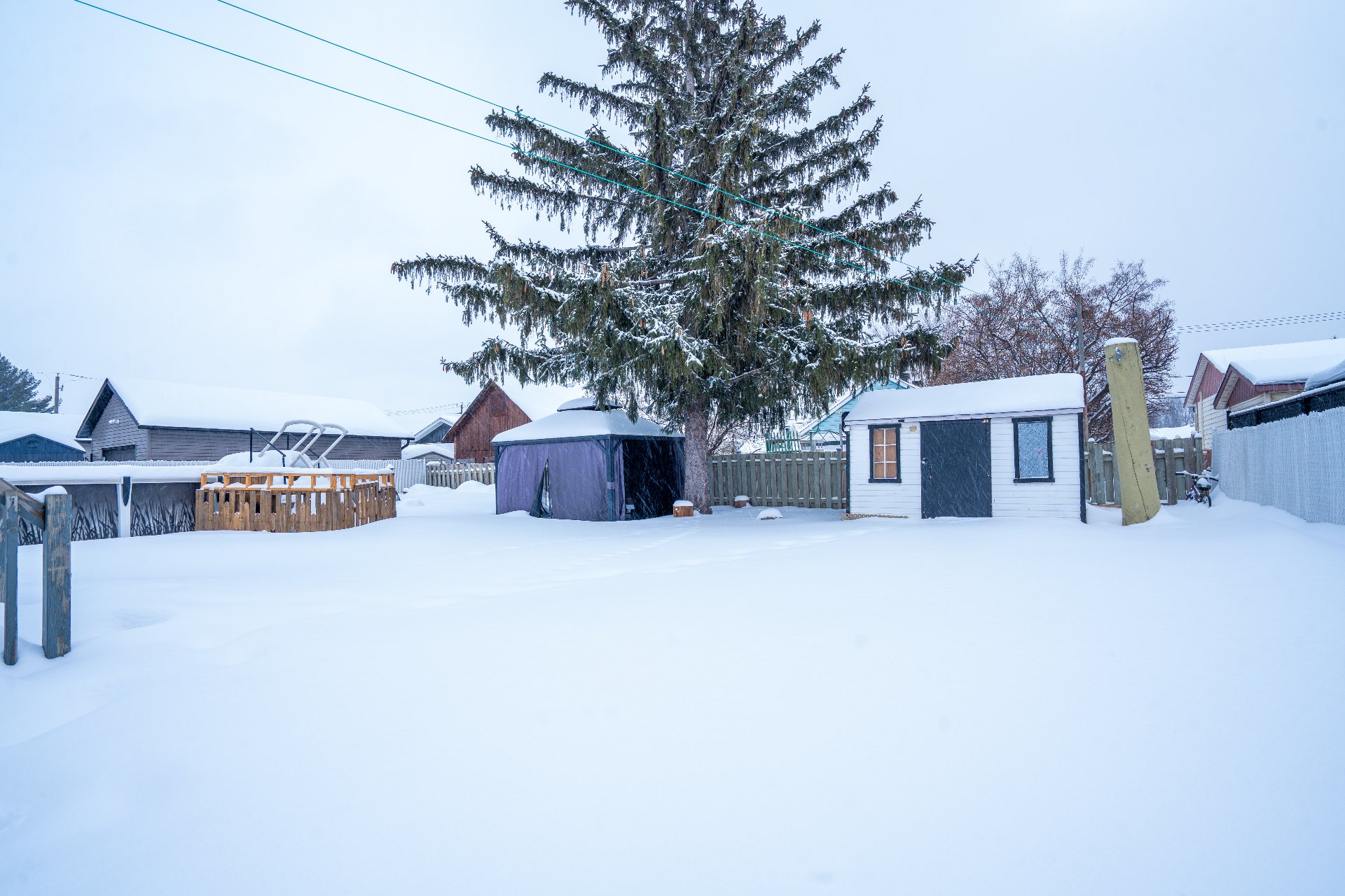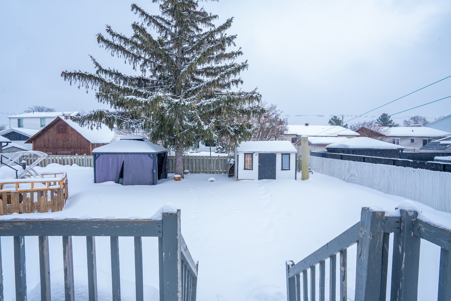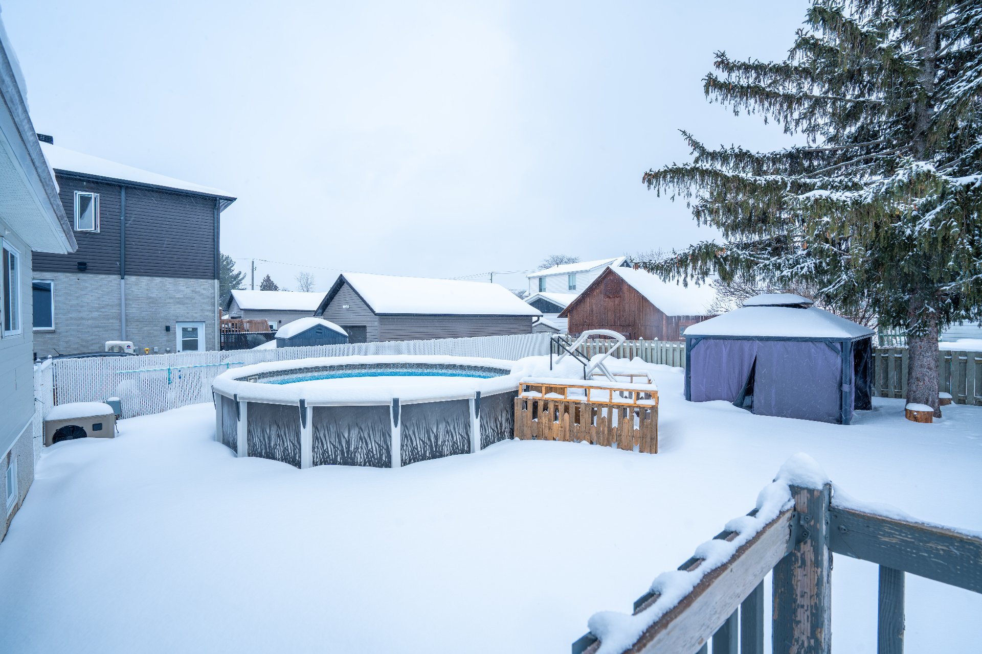 Inclus : piscine et accessoires, gazebo, cabanon, hotte micro-ondes